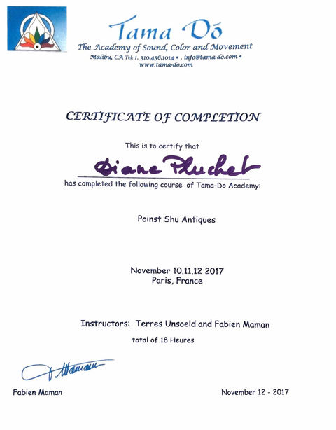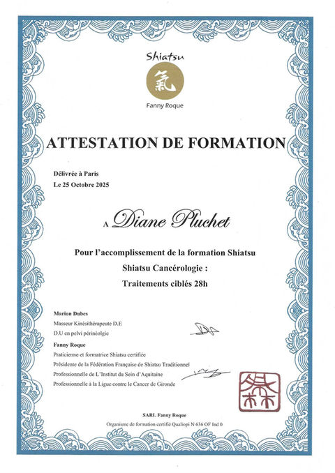• Certificat de Praticienne en Shiatsu, Ecole Aromathérapie-Shiatsu André Nahum, Paris